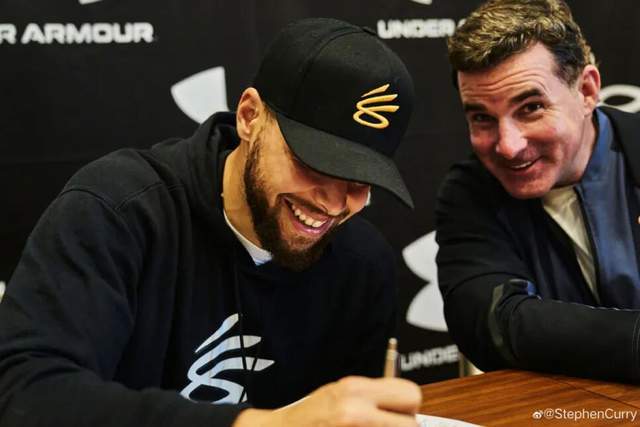 库里2023年与安德玛签约终身合同 右为安德玛创始人普兰克 图/StephenCurry微博