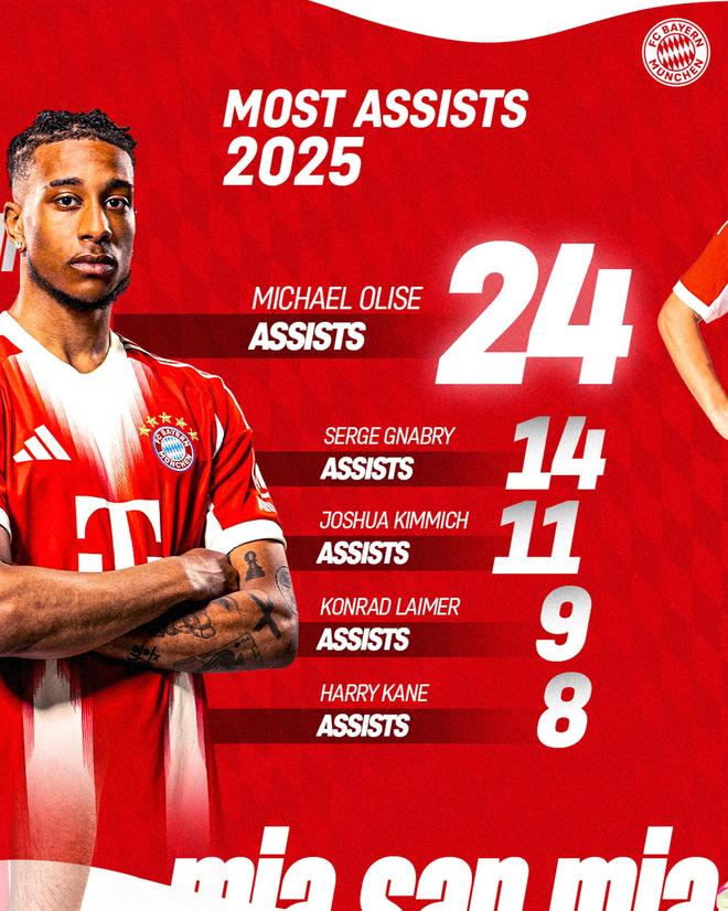 拜仁队内2025年度助攻榜: